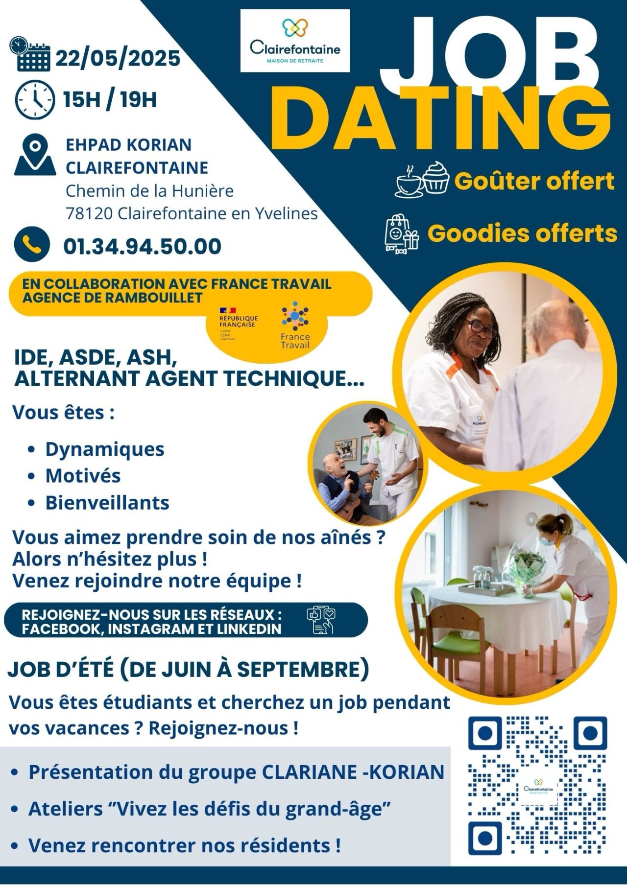 La Maison Korian Clairefontaine (78) organise son job-dating le jeudi 22 mai de 15h à 19h pour découvrir leurs métiers (infirmiers, aide-soignants, ASH…) et leurs opportunités.
