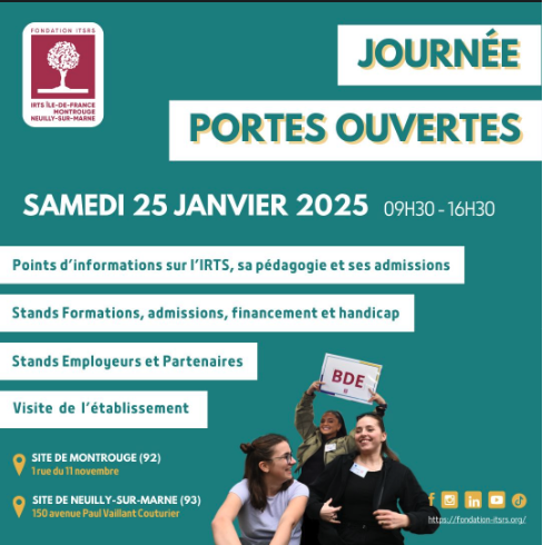 L’IRTS IDF Montrouge Neuilly-sur-Marne ouvre ses portes les samedi 25 janvier 2025 de 09h30 à 16h30 sur ses sites de Montrouge (92) et Neuilly-sur-Marne (93).