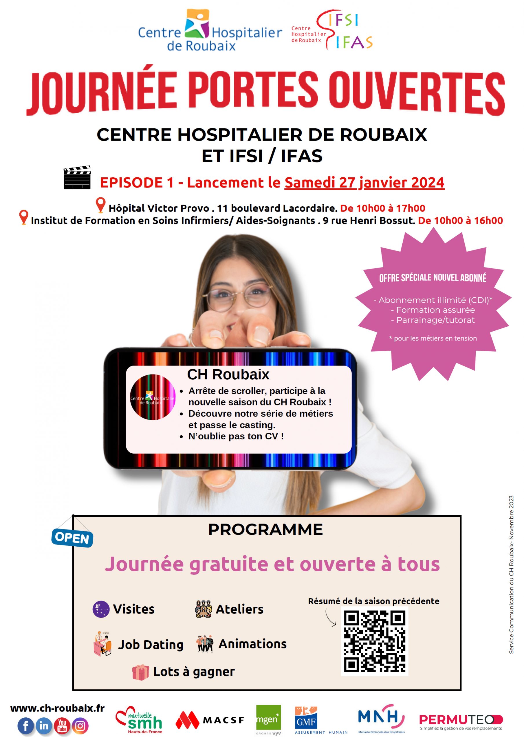 Ce jour-là, l’Institut de Formation en Soins Infirmiers/Aides-Soignants (IFSI/IFAS) du CH Roubaix ouvre également ses portes aux futurs étudiants infirmiers et élèves aides-soignants, le samedi 27 janvier 2024 de 10h à 16h, 9 rue Henri Bossut à Roubaix. L’occasion pour le public de rencontrer l’équipe pédagogique ainsi que des étudiants et élèves qui suivent actuellement la formation.