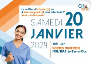 Le métier d’infirmier.e ou d’aide-soignant.e vous intéresse ? Venez le découvrir aux portes ouvertes de l’IFSI/IFAS du Centre Hospitalier Bar-le-Duc le samedi 20 janvier de 10h à 16h.