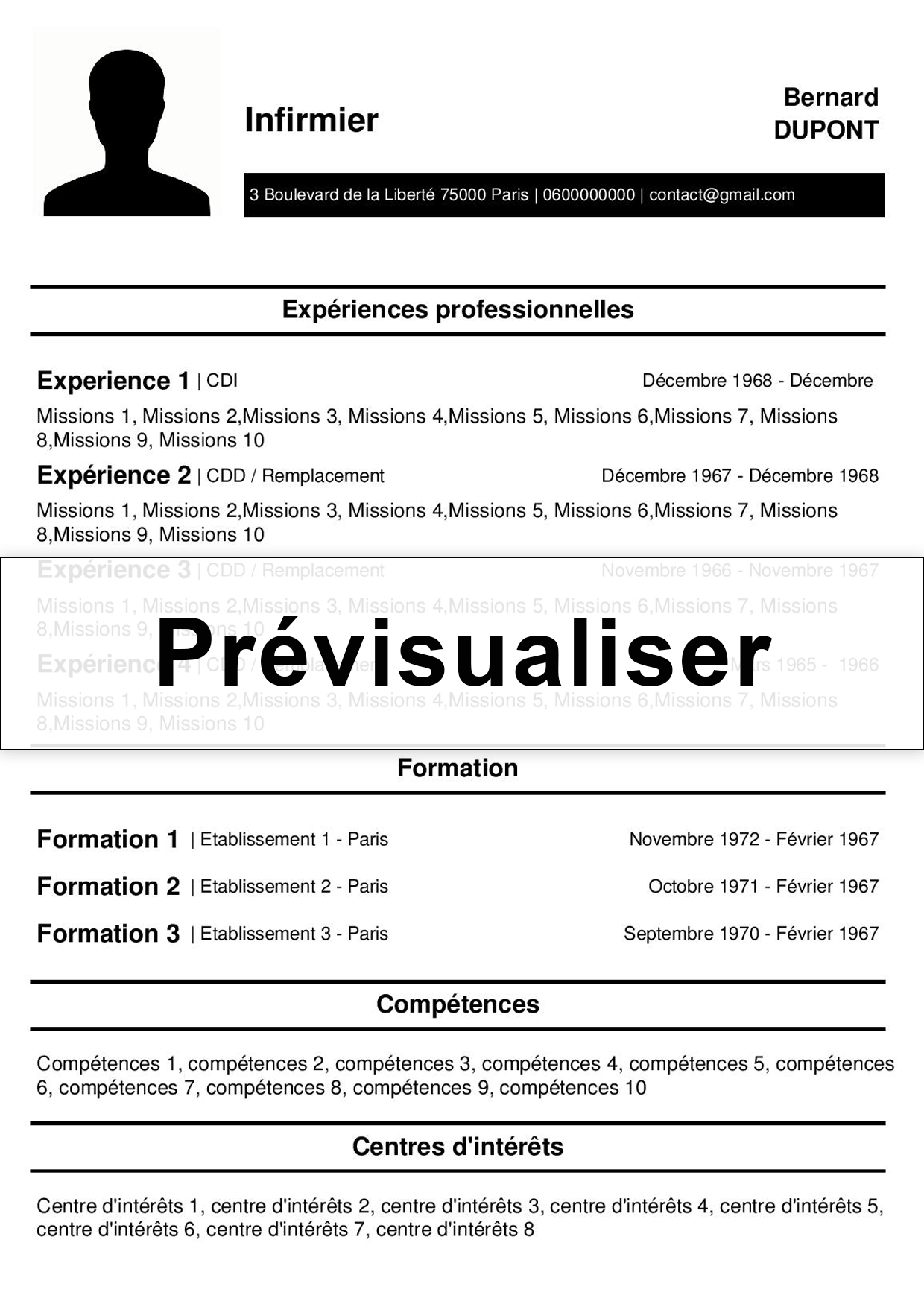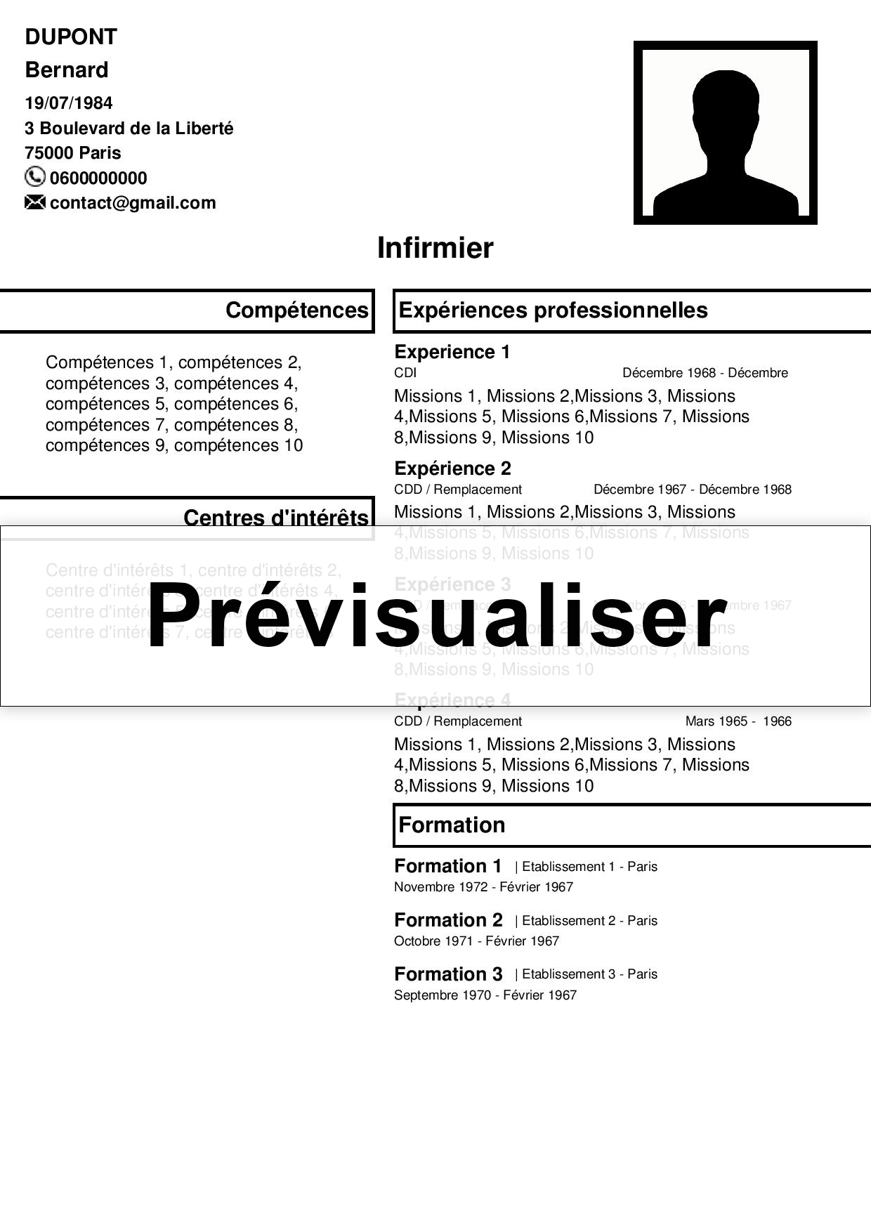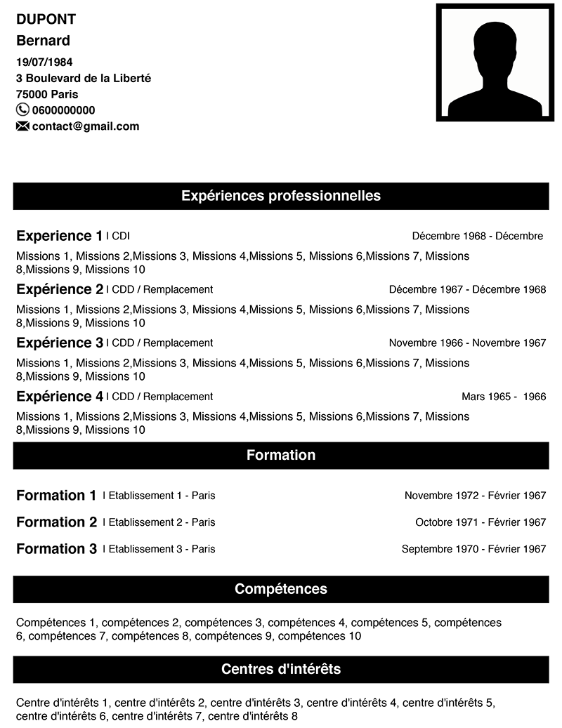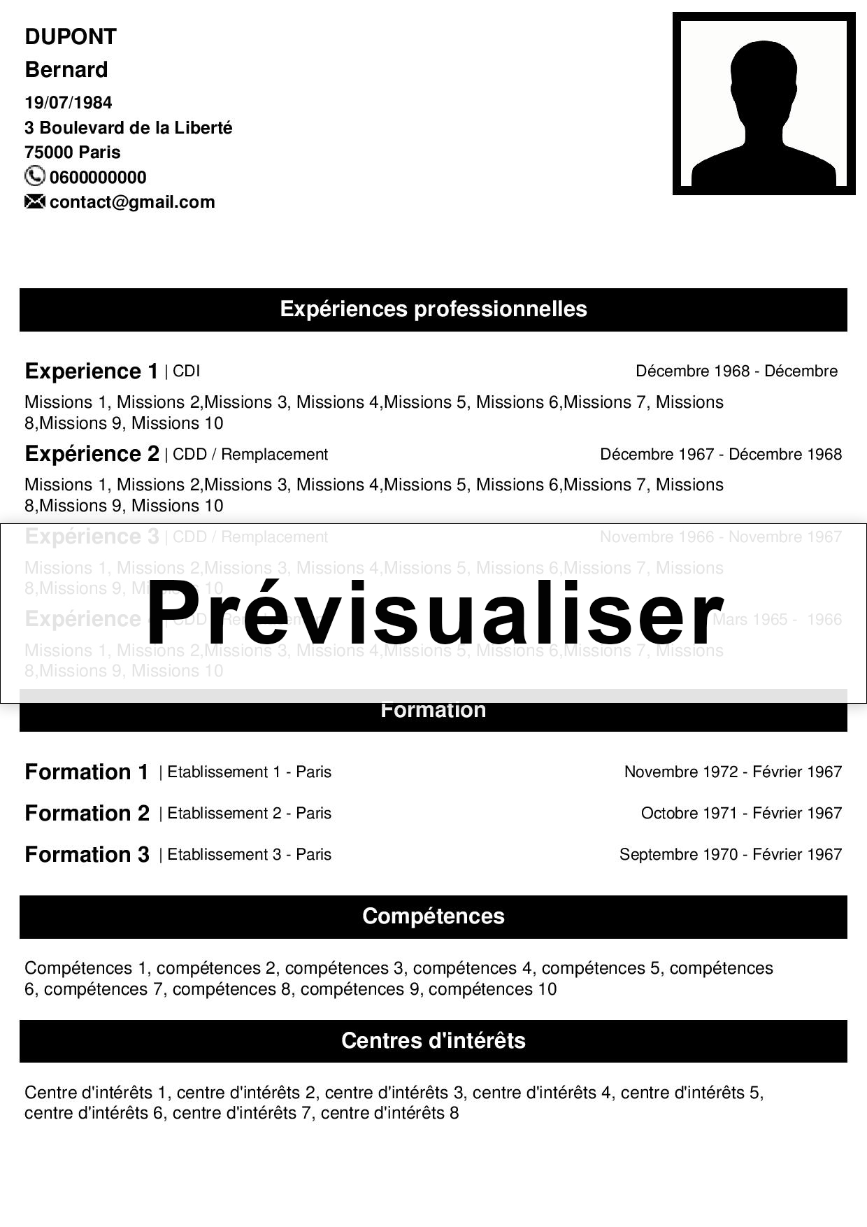 Utilisez le formulaire ci-dessous pour créer votre CV facilement parmi plusieurs modèles. Nous ne conservons aucune de vos informations.