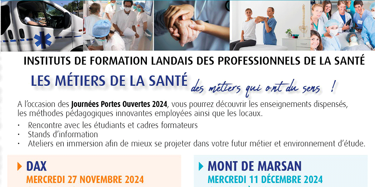 CH de Mont de Marsan 417 Av. Pierre de Coubertin, Mont-de-MarsanLes journées PORTES OUVERTES des instituts de formation Landais des professionnels de santé - IFSI/CFPS/IFAS/IFMK/Formation continue - auront lieu le mercredi 11 décembre 2024 de 13h30 à 17h30 à Mont de Marsan
