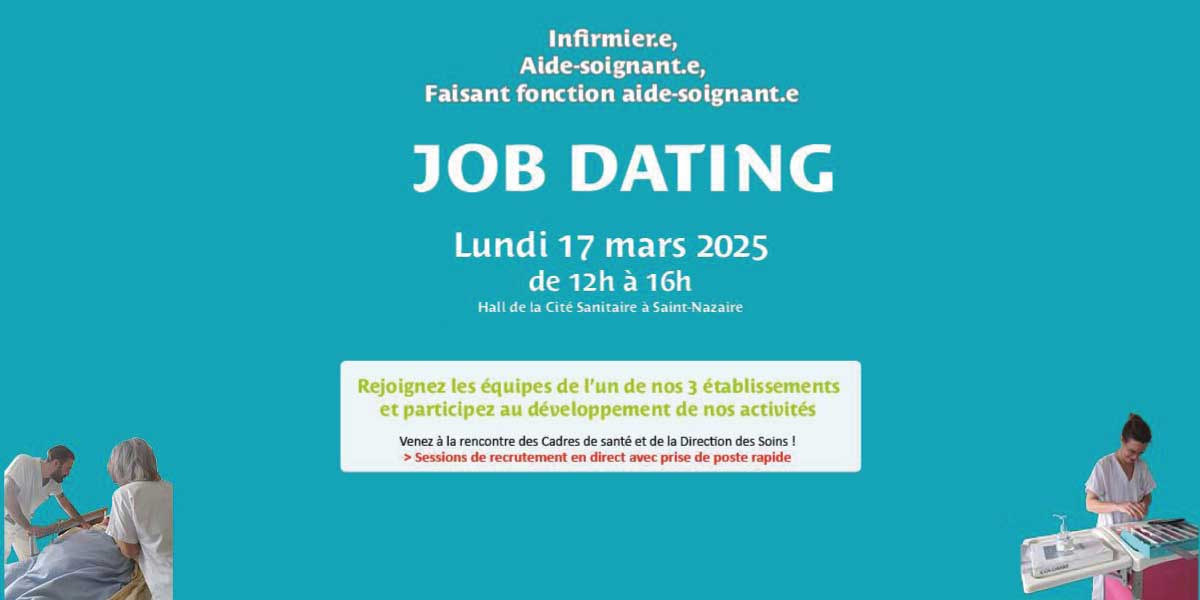 Cité sanitaire Saint NazaireLes Centres hospitalier de Saint-Nazaire, de Savenay et l'Hôpital intercommunal de la presqu'île Guérande - Le Croisic, vous invitent à un Job Dating le lundi 17 mars prochain, de 12h à 16h à la Cité Sanitaire, à Saint-Nazaire.